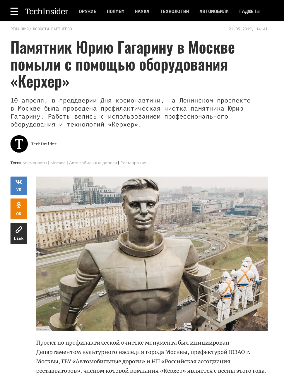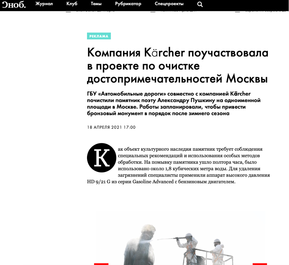 - Популяризация и продвижение результатов В2В проекта «Помывка памятника с Kärcher»